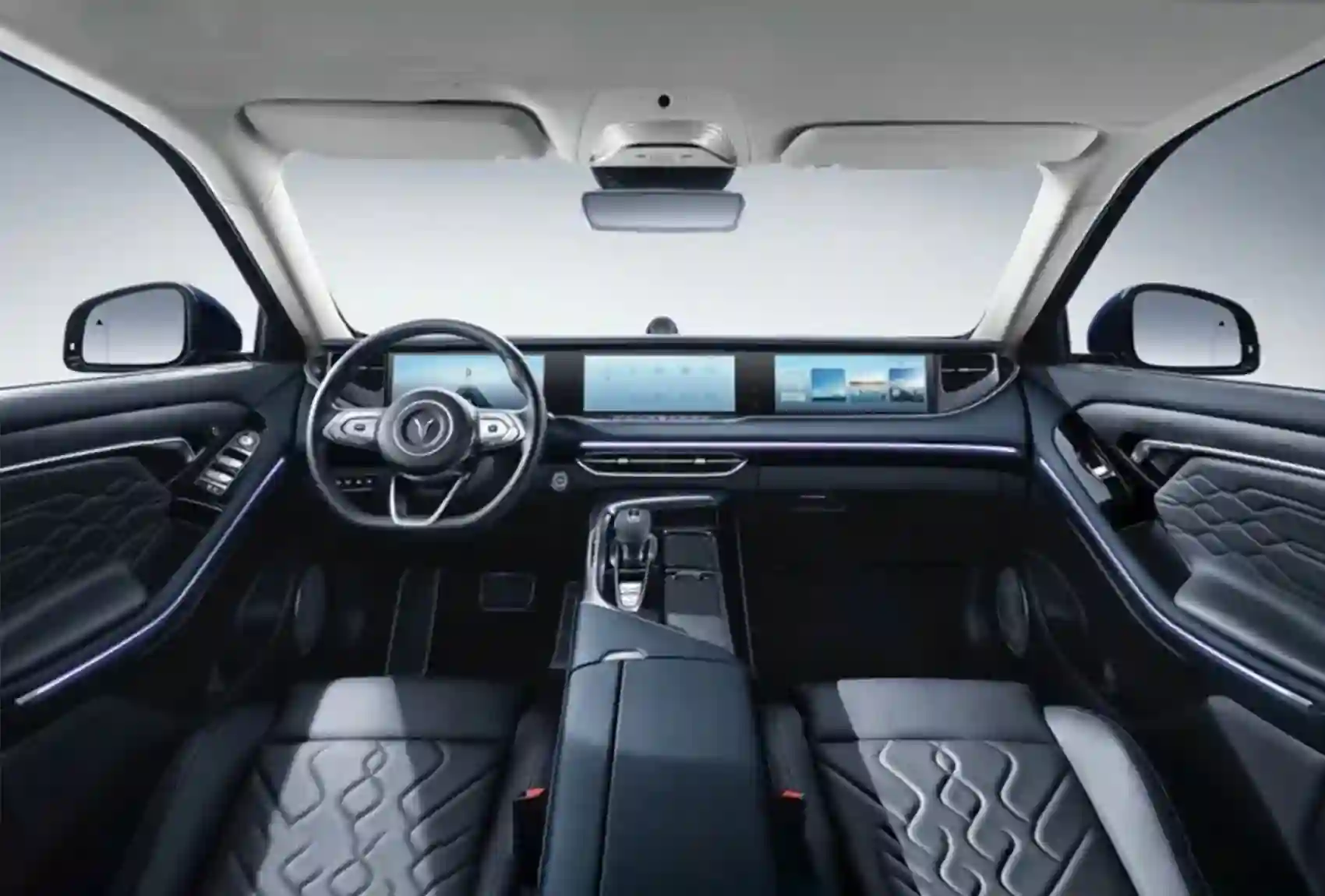Интерьер тоже хорош — все сделано не только дорого, но и со вкусом, что еще важнее. Взять хоть подбор расцветок: можно выбрать классическую пару классического и черного, но интереснее выглядит сочетание темно-синего с кремовым — и оригинально, и в рифму с яхтенной тематикой. За оригинальность в интерьере отвечает уникальная передняя панель. Дело не в трех экранах: такое автомобилисты видели неоднократно. А вот электроприводов, которые двигают всю панель вверх-вниз, нет больше ни у кого. Зачем? Просто затем, что китайцы могут.
